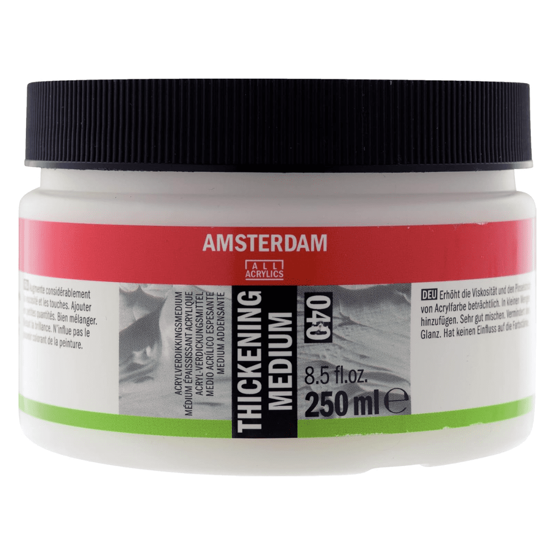 Para lograr una pincelada más definida y visible, agregue el medio espesante Amsterdam a su pintura. Cree una consistencia espesa agregando solo una pequeña cantidad de este medio a sus colores acrÃlicos Amsterdam. Este medio no afecta la intensidad del color ni la opacidad de la pintura, ya que solo necesita una pequeña cantidad.