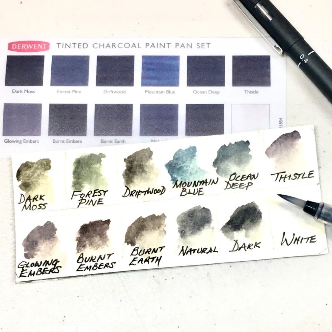 El Derwent Tinted Charcoal Paint Pan Set es una innovadora propuesta para artistas que buscan experimentar con la expresividad del carbón en un formato completamente nuevo. Esta paleta reúne 12 tonos de carbón tintado, creados con una fórmula única soluble en agua, lo que permite disfrutar de la riqueza y la textura del carbón con la versatilidad de la acuarela.