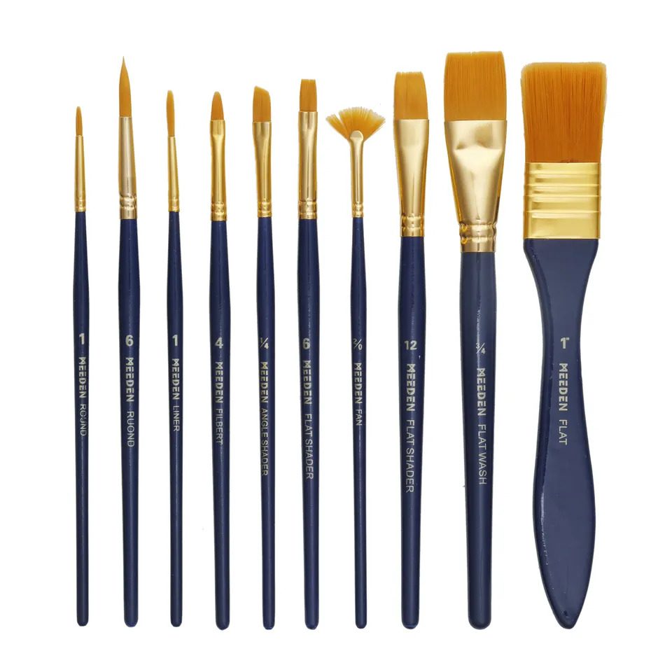Incluye 10 tamaños y tipos diferentes para acrílico. Plano, filbert, abánico, detalle.