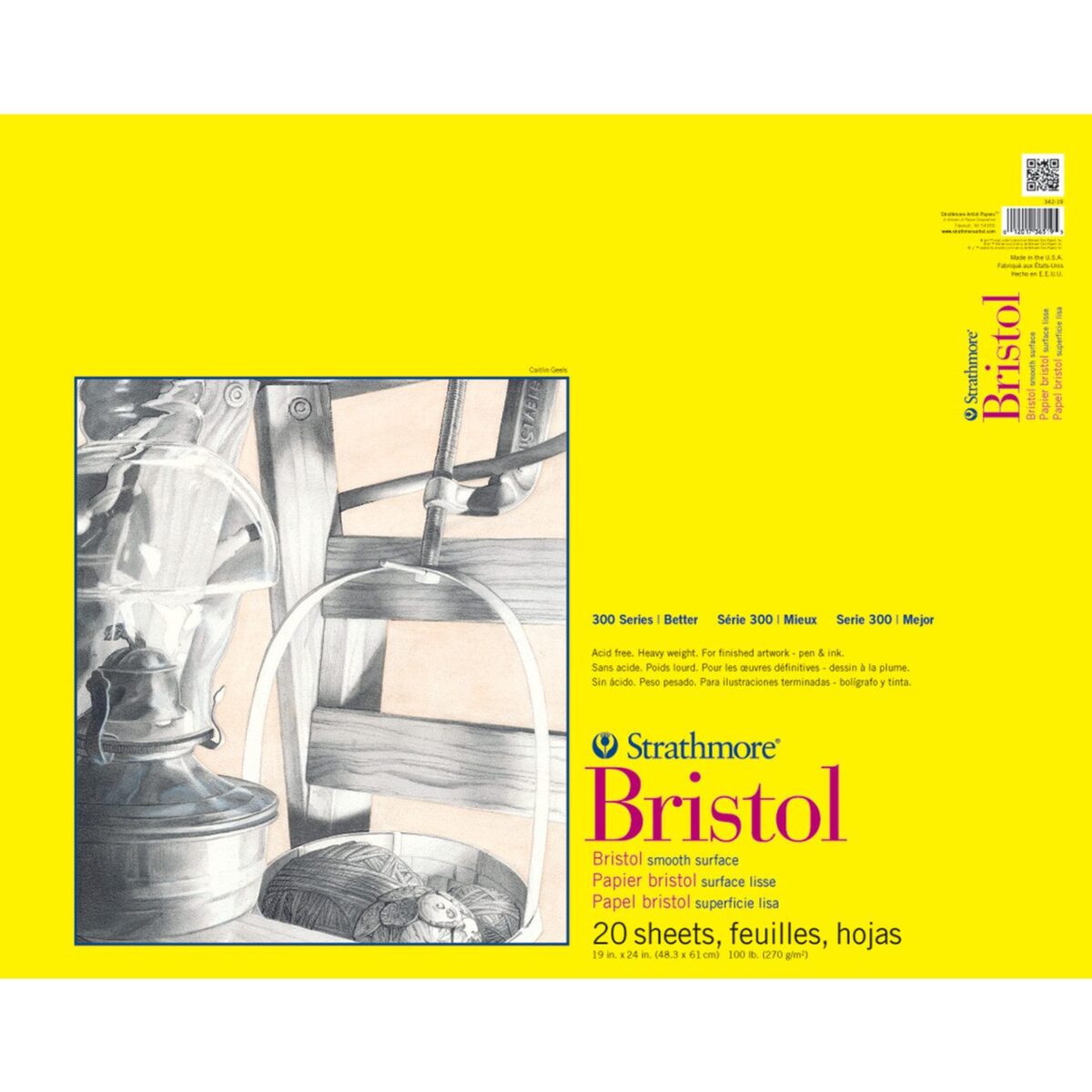Bloc de papel Bristol Strathmore-Vellum. Un papel de alto gramaje 270 g/m² con un acabado de superficie vitela ideal para dominar las técnicas de dibujo en seco. Este paquete contiene un bloc de papel bristol de 19×24 pulgadas, papel libre de ácido.