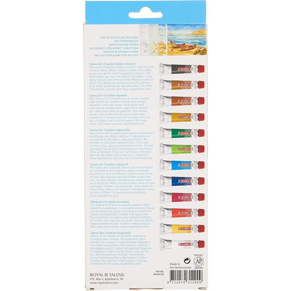 El juego de acuarela Talens Art Creation hace que sea fácil crear infinitas variaciones de colores y combinaciones de mezcla. El juego de acuarela se puede utilizar en todas las superficies de acuarela convencionales. Perfecto para personas de todas las edades, se puede utilizar para pintar, ilustrar, colorear, bocetos, diseño, álbumes de recortes, dibujos animados y animación. Los colores son intercambiables, lo que da infinitas posibilidades de color. Ofrece una gran paleta básica de colores para crear varias pinturas. Debido a su tamaño conveniente. Estos tubos son ideales para tener en tu estudio o para llevar contigo mientras viajas. El juego contiene: 12 tubos de 0.4 fl oz (108 blanco chino, 200 amarillo, 334 escarlata, 326 Alizarin Crimson, 504 Ultramarine, 535 azul cerúleo (ftalo), 617 verde amarillento, 602 verde oscuro, 227 ocre amarillo, 411 siena quemada, 409 Umber quemado, 7 08 gris Payne).